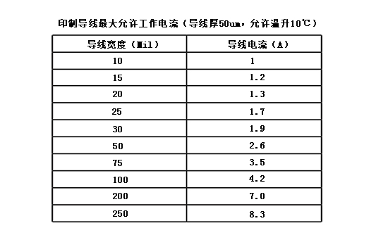 銅線的寬度應根據(jù)其能承載的電流進行設計。銅線的載流量取決于以下因素:線寬、導線厚度(銅鉑厚度)、允許溫升等。下表給出了銅線寬度、導線面積和導電電流(軍用標準)之間的關系。根據(jù)這一基本關系,可以適當考慮導線寬度。